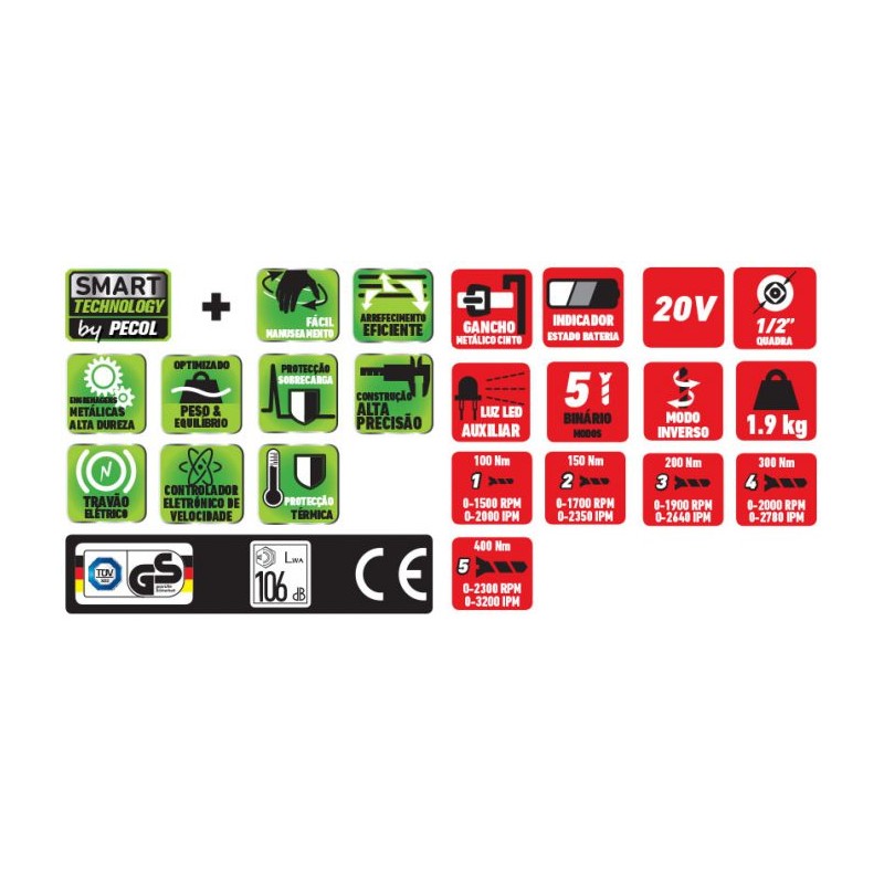 - 400 Nm 5: 0-2300 rotações por minuto | 0-3200 impactos por minuto