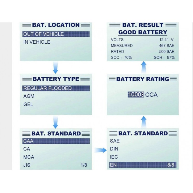 8. Padrões de Teste incluem atualmente a maioria dos padrões de bateria do mundo, CCA, BCI, CA, MCA, JIS, DIN, IEC, EN, SAE, GB.